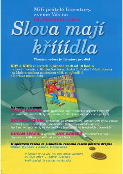 7. března od 19 hodin, Vás zveme na 64. literární večer, nazvaný Slova mají křííídla, tentorkát na téma Literatura pro děti.
