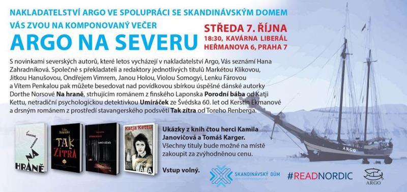 Nakladatelství Argo, Skandinávský dům a Kavárna Liberál pořádají ve středu 7. 10. od 18:30 besedu, která za účasti překladatelů a překladatelek Markéty Klikové, Jitky Hanušové, Jany Holé a Ondřeje Vimra a redaktorek Violy Somogyi a Lenky Fárové představí čtyři severské novinky, které letos vydalo či brzy vydá nakladatelství Argo.