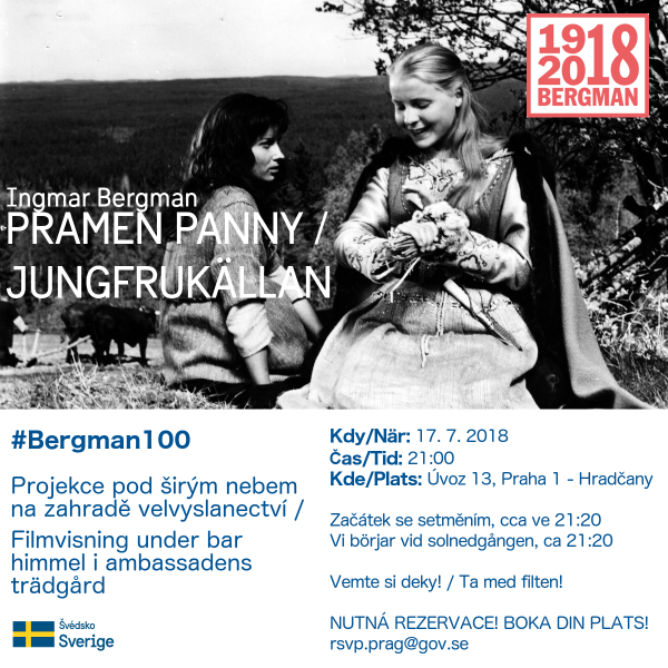 zveme Vás na akci švédské ambasády, která se koná v rámci akcí Bergman100, připomínající sté výročí narození švédského režiséra Ingmara Bergmana. V úterý 17. 7. od 21 hodin můžete na zahradě velvyslanectví (adresa Úvoz 13, Praha 1-Hradčany) zhlédnout jeho film Prameny panny.